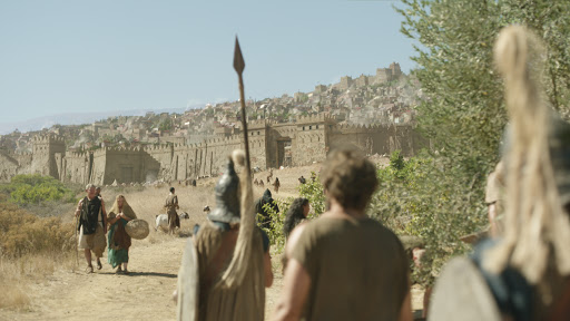A leur tour, les Phéniciens mirent à la voile leurs plus solides vaisseaux et cinglèrent prestement vers les terres d'Afrique. Aidés par Shadrapha leur Dieu sauveur, les marins du Roi Zimrida évitèrent judicieusement les hauts-fonds de la grande Syrte, le kraken, la tempête, les sirènes et tous les écueils de la Méditerranée, pour arriver au Cap Bon. Là, le long d'une côte avare en bons points d'ancrage et balayée par des rafales de vents insidieux, la présence d'une large anse protégée apportait une garantie de prospérité. Les Phéniciens s'installèrent au pied des palmiers et d'une vigne généreuse, pour fonder Qart-Hadašt, "la nouvelle ville".