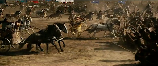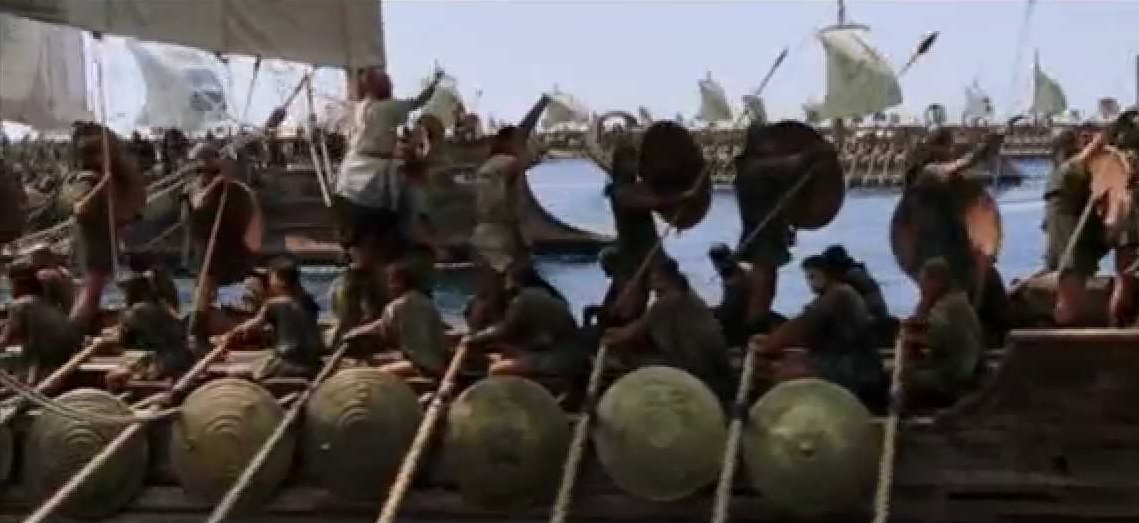 Les mers étaient devenues les nouveaux théâtres de la guerre. Des galères par centaines se présentaient soudain à l'ennemi, en voguant rapidement, fendant les flots d'une double trace d'écume blanche. Les cordages tendus étaient prêts à céder, les voiles gonflées étaient sur le point de se déchirer, mais les capitaines continuaient à foncer droit devant en priant Eole. Que de combats allaient surgir de ces manoeuvres maritimes dans un prodigieux fracas... Mais avant cela, il fallait que l'on vous narre la guerre de Troie, où la situation se compliquait pour Priam.